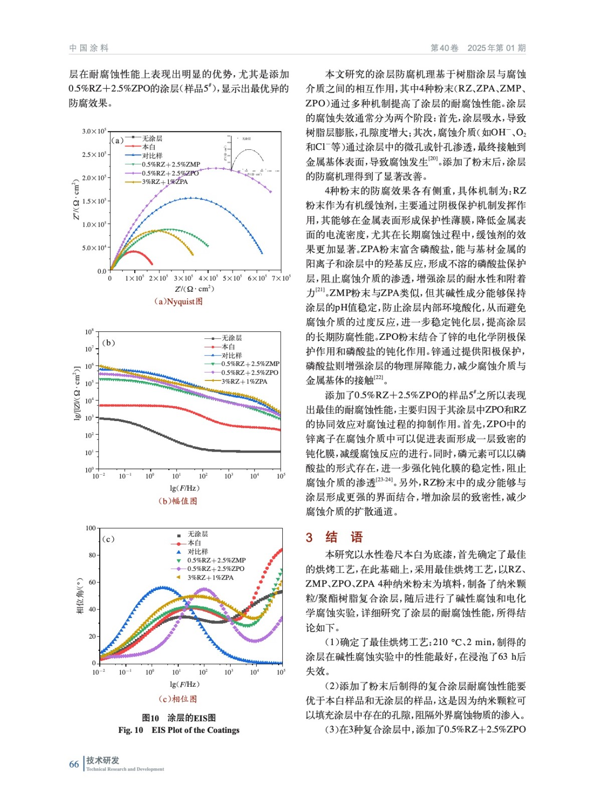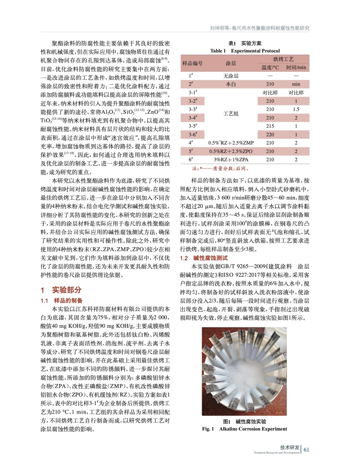 摘要:以水性聚酯涂料為底漆,研究了不同烘烤工藝對涂層耐堿性腐蝕的影響。在確定最佳烘烤工藝(210 ℃、2 min)后,實驗加入了多磷酸鉬鋅水合物(ZPA)、改性正磷酸鹽(ZMP)、有機改性磷酸鋅鋁鉬水合物(ZPO)、有機緩蝕劑(RZ)4種納米粉末,結合電化學測試和堿性腐蝕實驗,評估其對涂層耐腐蝕性能的影響。實驗結果表明,加入納米粉末后,涂層的耐腐蝕性能顯著提升,尤其是添加0.5%(質量分數,后同)RZ+2.5%ZPO的涂層表現出最佳的電化學耐腐蝕性能。該研究為開發高性能卷尺用聚酯涂層提供了有效的理論依據與實驗支持。