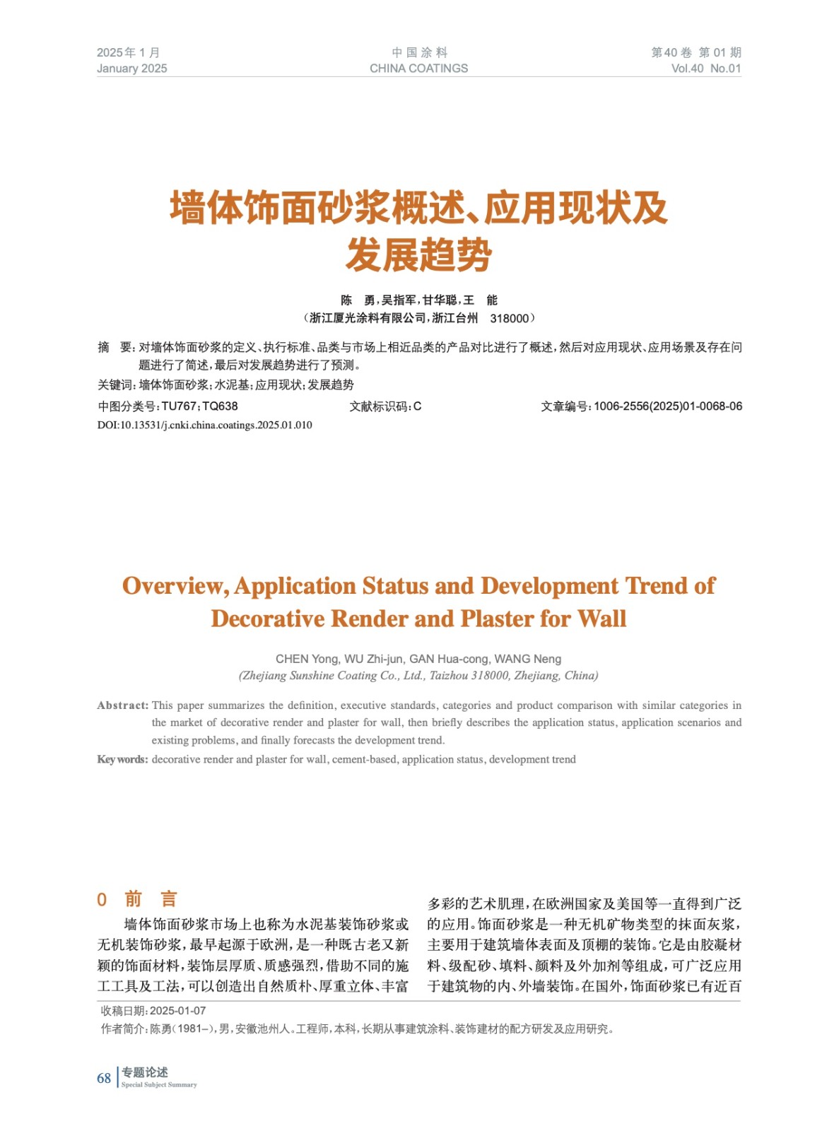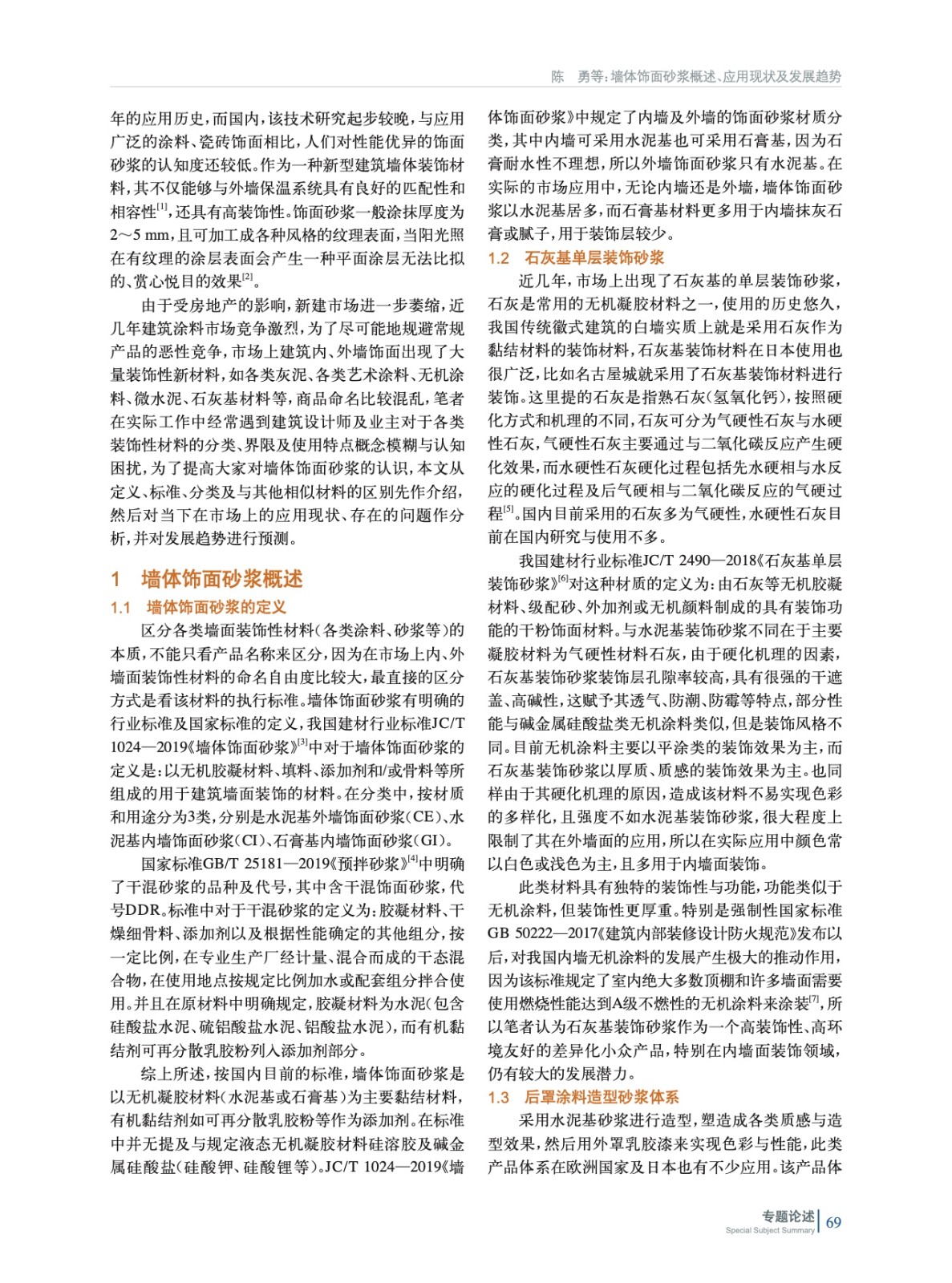 對墻體飾面砂漿的定義、執行標準、品類與市場上相近品類的產品對比進行了概述,然后對應用現狀、應用場景及存在問題進行了簡述,最后對發展趨勢進行了預測。