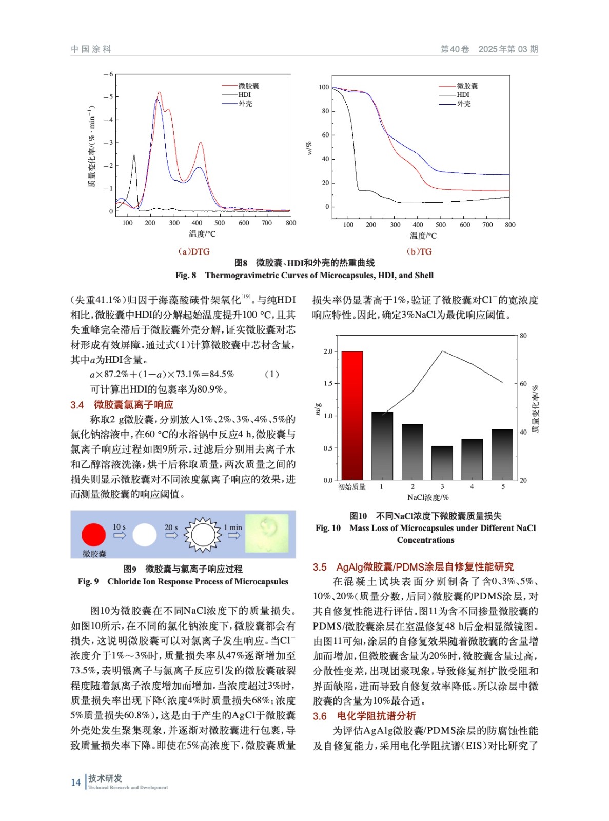 摘要:利用海藻酸鈉為壁材原料,六亞甲基二異氰酸酯為芯材原料,通過內(nèi)源乳化法制備海藻酸銀(AgAlg)微膠囊,通過控制不同碳酸銀含量和稀硝酸濃度、進(jìn)料速度探討了微膠囊最佳合成工藝,對微膠囊形貌、化學(xué)結(jié)構(gòu)、熱穩(wěn)定性及芯材含量進(jìn)行了研究,并通過微膠囊觸發(fā)微膠囊響應(yīng)氯離子濃度進(jìn)行表征。將微膠囊加入PDMS涂層,制備AgAlg微膠囊/PDMS自修復(fù)涂層,對其進(jìn)行劃痕試驗(yàn)和電化學(xué)阻抗分析,通過與PDMS涂層相對比,結(jié)果表明氯離子響應(yīng)微膠囊具有較強(qiáng)的自修復(fù)能力。
