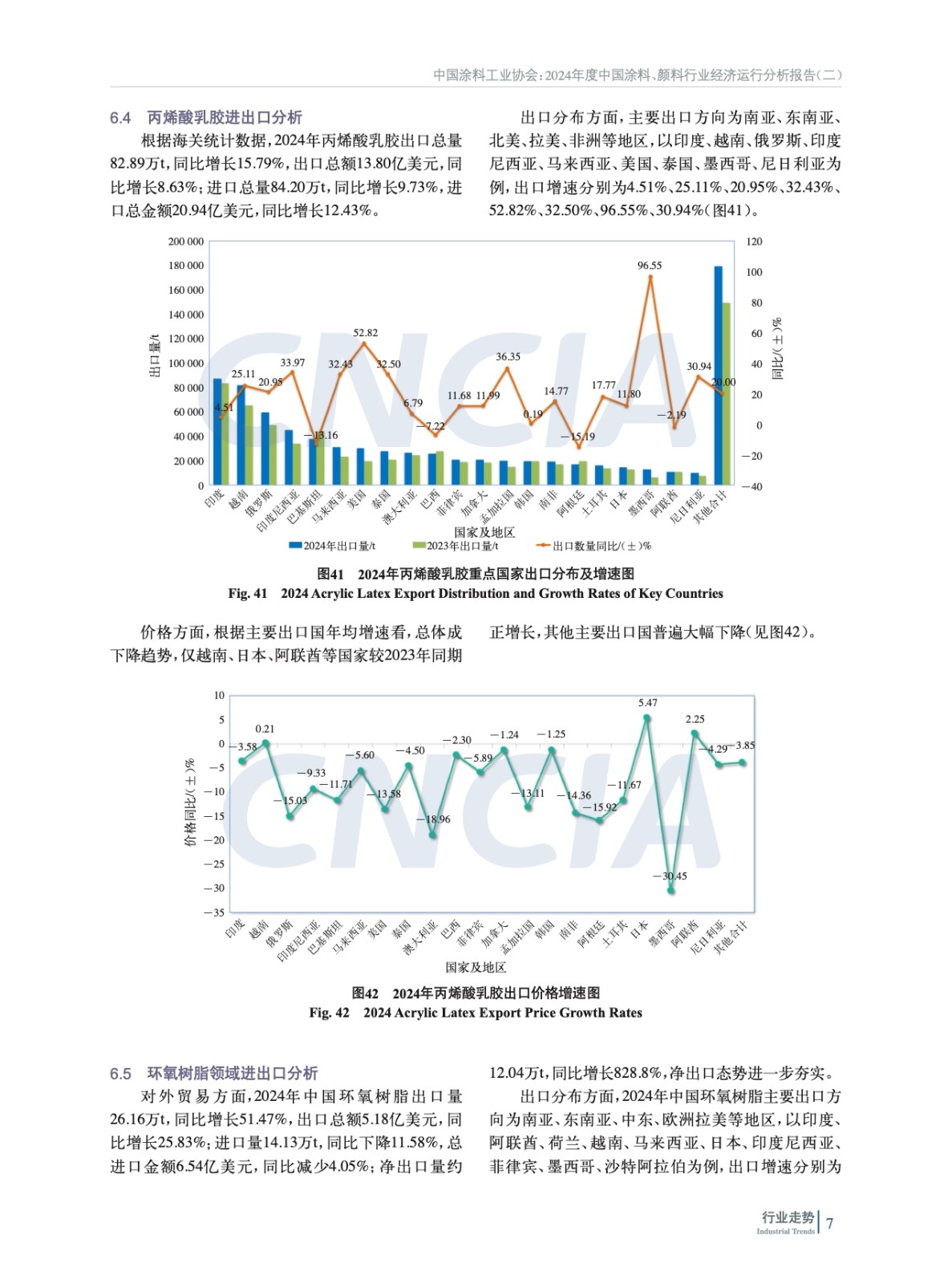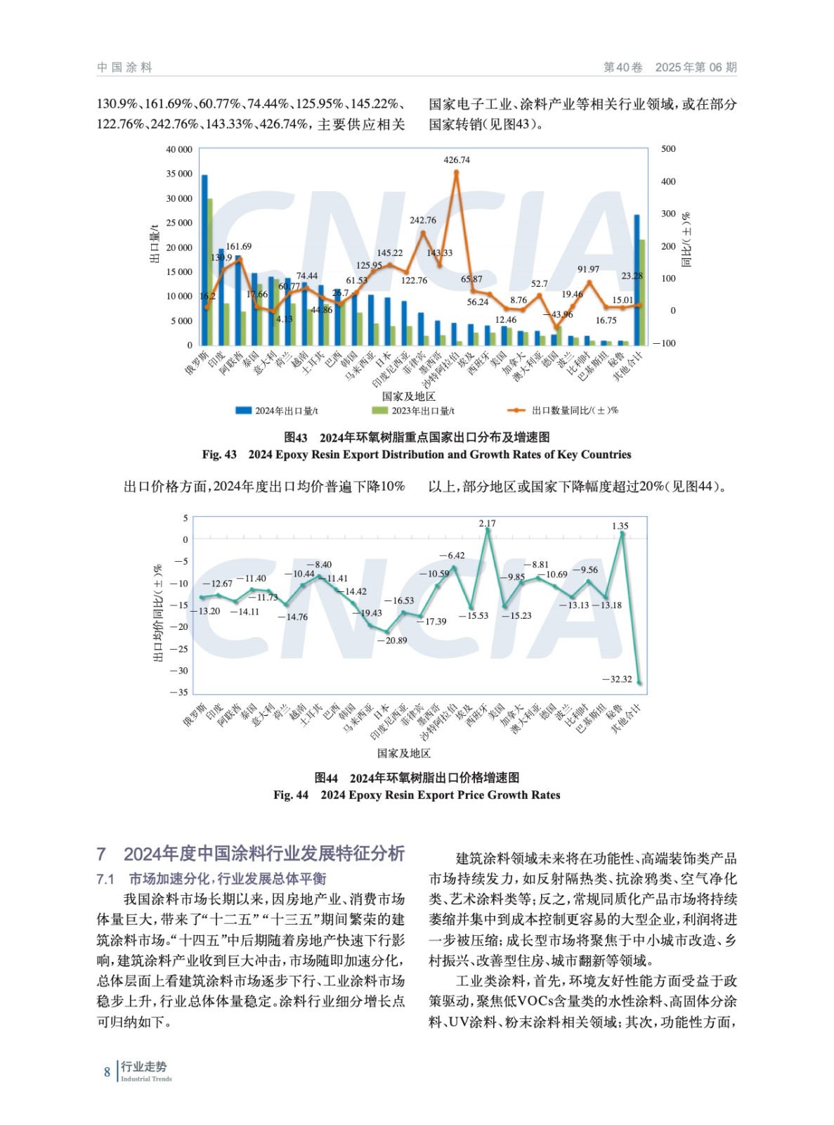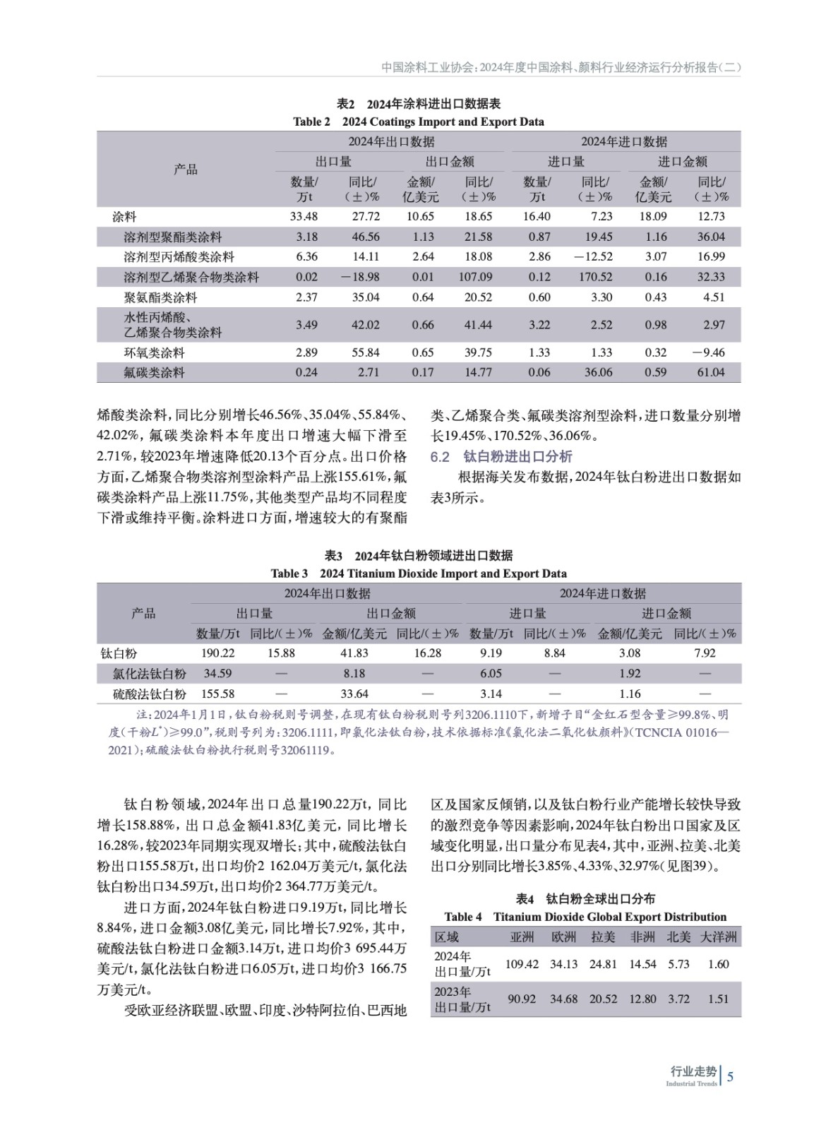 摘要:簡析了2024年中國宏觀經(jīng)濟(jì)及外部環(huán)境發(fā)展情況,概括介紹了2024年房地產(chǎn)、機(jī)械、集裝箱、船舶、家具、新能源等涂料重點(diǎn)下游行業(yè)、新興領(lǐng)域發(fā)展概況及對涂料行業(yè)的影響,重點(diǎn)分析了2024年度中國涂料行業(yè)發(fā)展和進(jìn)出口情況。綜述了全球涂料行業(yè)發(fā)展概況,對2024年全球涂料行業(yè)發(fā)展影響因素、全球涂料行業(yè)增長動(dòng)力、全球涂料行業(yè)細(xì)分領(lǐng)域趨勢進(jìn)行了分析。最后對涂料上游鈦白粉、氧化鐵、丙烯酸乳液和環(huán)氧樹脂等重點(diǎn)原材料領(lǐng)域發(fā)展情況進(jìn)行了概述,并對中國涂料行業(yè)特征和發(fā)展趨勢進(jìn)行了分析和預(yù)測。