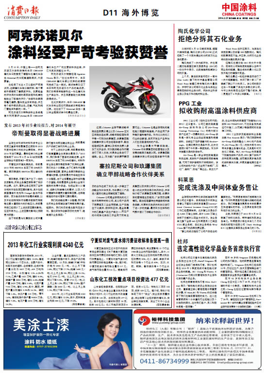 《中國涂料報》(電子版)的一切內容(包括但不限于文字、圖片、PDF、圖表、標志、標識、商標、版面設計、專欄目錄與名稱、內容分類標準以及為讀者提供的任何信息)僅供中國涂料信息網讀者閱讀、學習研究使用,未經中國涂料雜志社有限公司及/或相關權利人書面授權,任何單位及個人不得將《中國涂料報》(電子版)所登載、發布的內容用于商業性目的,包括但不限于轉載、復制、發行、制作光盤、數據庫、觸摸展示等行為方式,或將之在非本站所屬的服務器上作鏡像。否則,中國涂料雜志社有限公司將采取包括但不限于網上公示、向有關部門舉報、訴訟等一切合法手段,追究侵權者的法律責任。